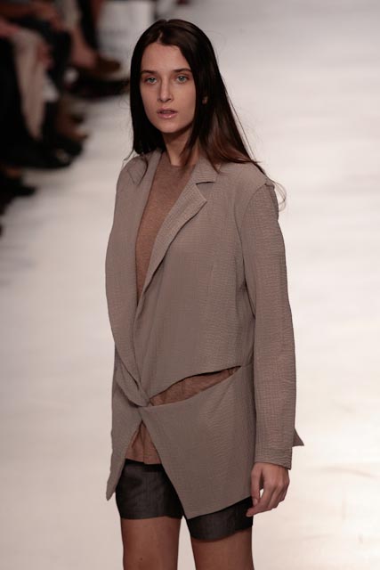 White Tent trouxe-nos, assim, uma colecção jovem e urbana com boas propostas de roupa exterior numa paleta de cores soft como o pérola, azul, castanho, cinza e branco com apontamentos de vermelho e preto. A escolha de materiais conferiram um drapeado orgânico às estruturas e faz parte da assinatura do White Tent - a enfâse na escolha de materiais como a lã de Verão lavada, o algodão, fios de algodão encerado, as malhas tricotadas... de que aliás gostei bastante, os jerseys... que conferem às peças um toque muito confortável.