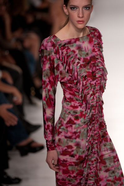 Os detalhes eram lindissimos, imperam ondulações e pregueados, somados a um código de cores eclético onde se associam os rosas, cinzas, preto, branco e estampados primaveris.